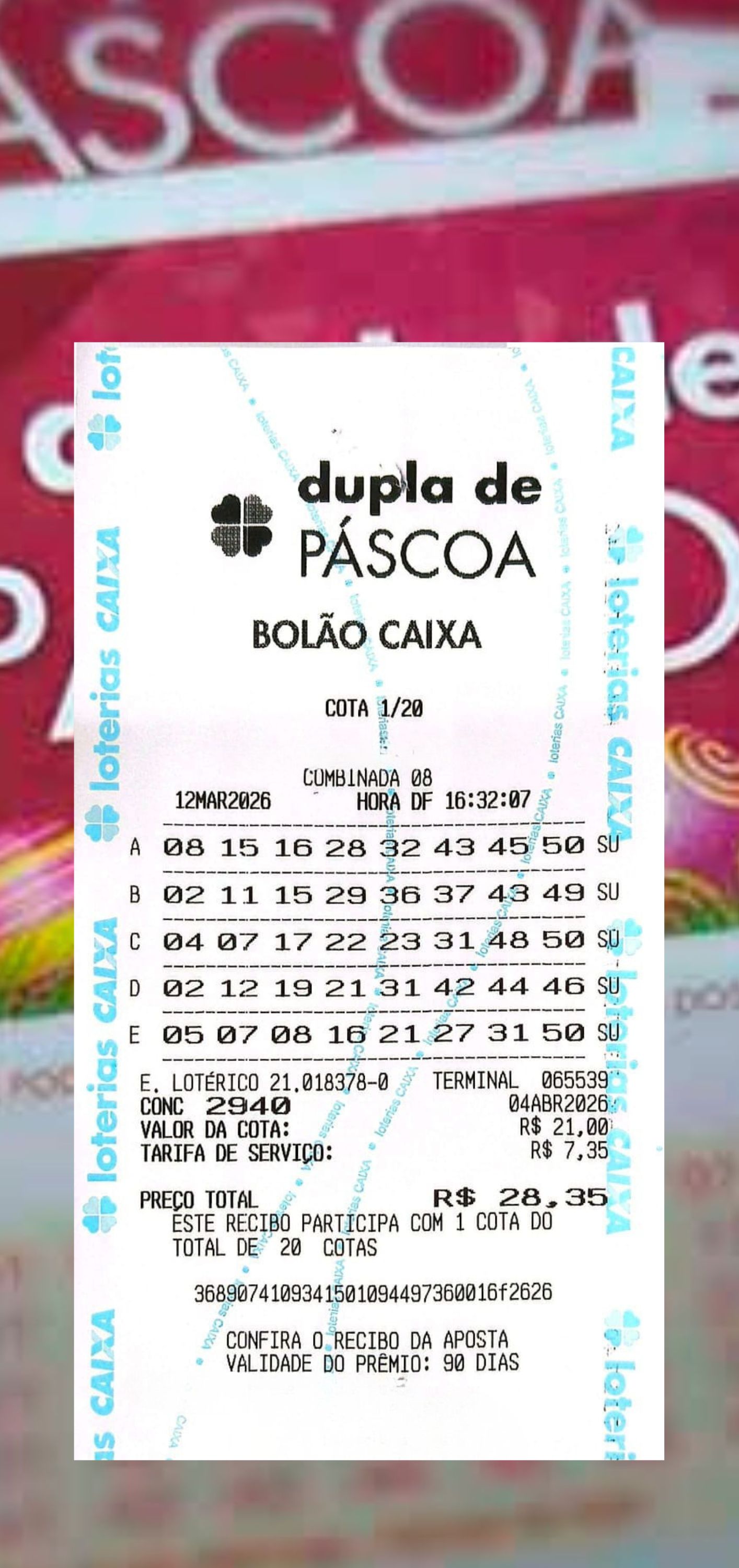 | 16032026-5EN | 5 jogos • 8 dezenas 0815162832434550 | 10 / 20 | R$ 28,35 | 1 |